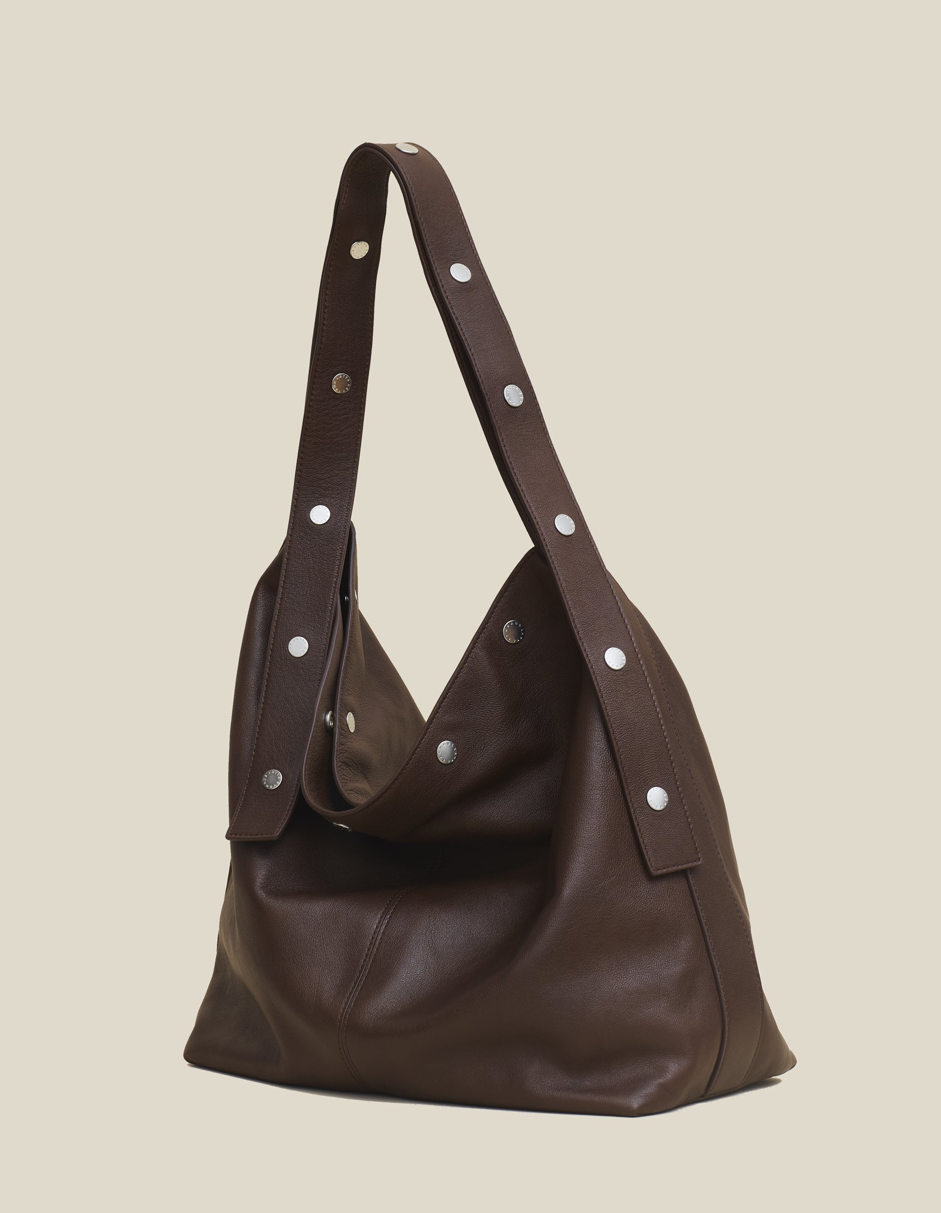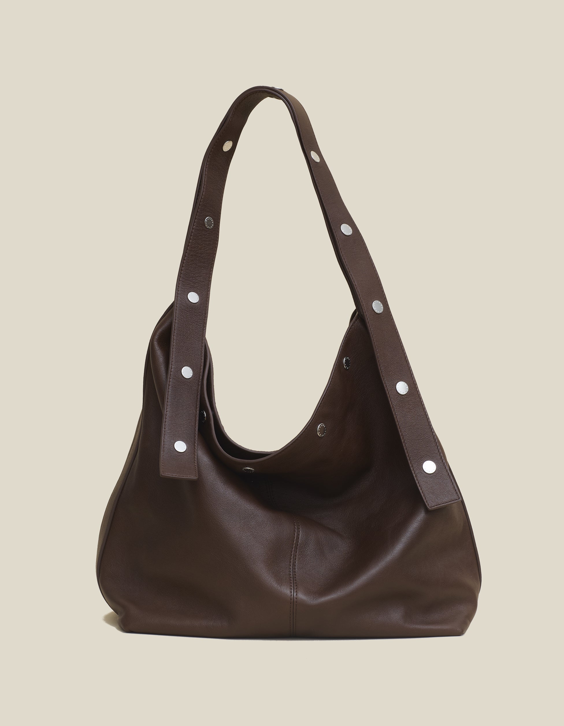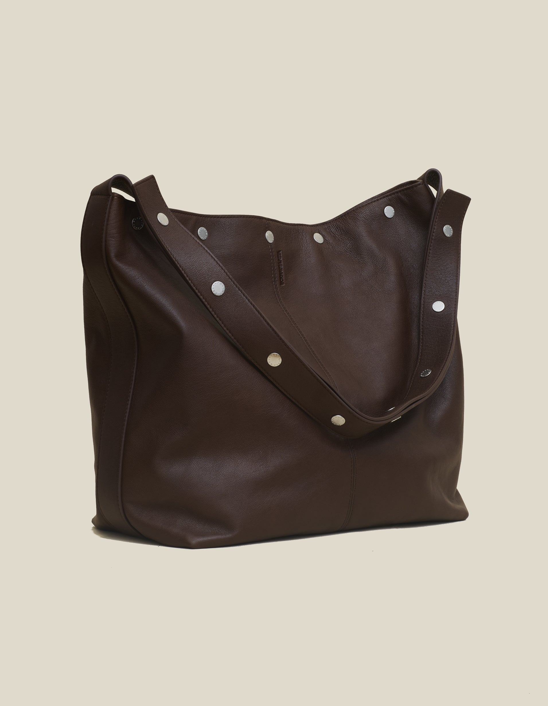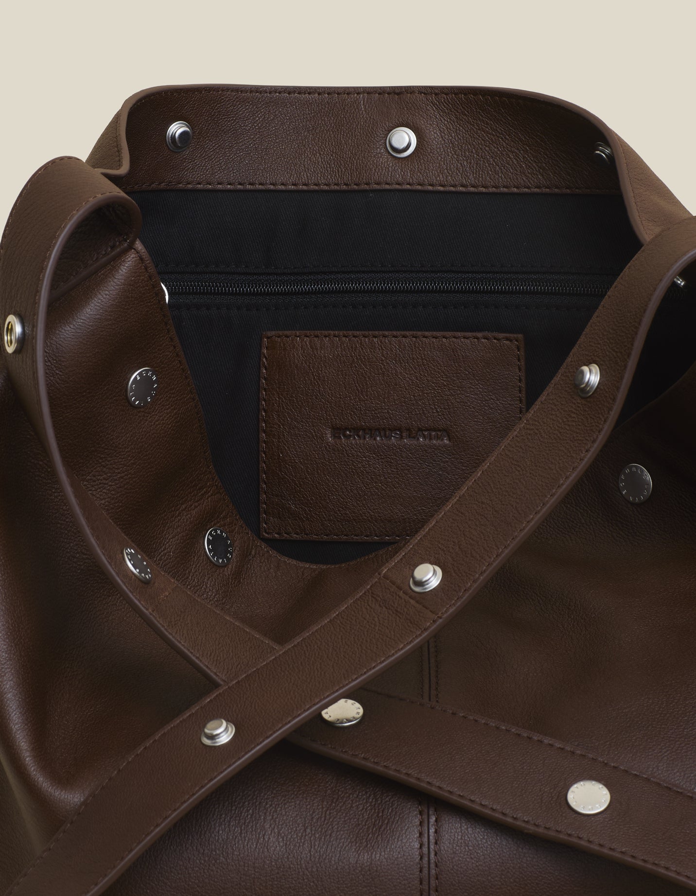 Expanding on the world of The Snap, The Bucket offers a more utilitarian approach. This spacious bag easily fits a laptop, book, and water bottle with room to spare. The straps snap together, allowing the user to adjust the handle drop between 7 inches and 51 inches, easily transforming from shoulder bag to cross body bag. Made in vegetable dyed Italian lambskin with a debossed logo and custom logo snaps. Internal zip pocket.