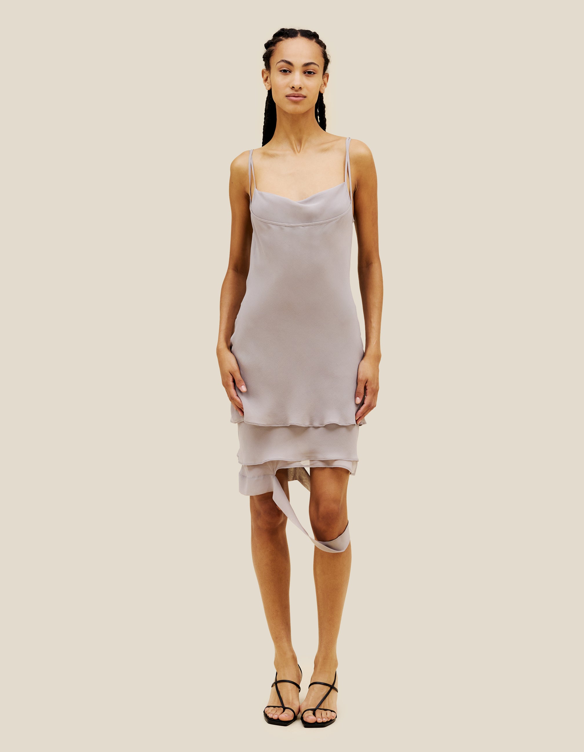 Double-layered dress in silk chiffon, featuring top-layer panels that kiss at the front and back, straight legs with a side-seam slit, an optional apron skirt overlay, and a center-back invisible zipper.