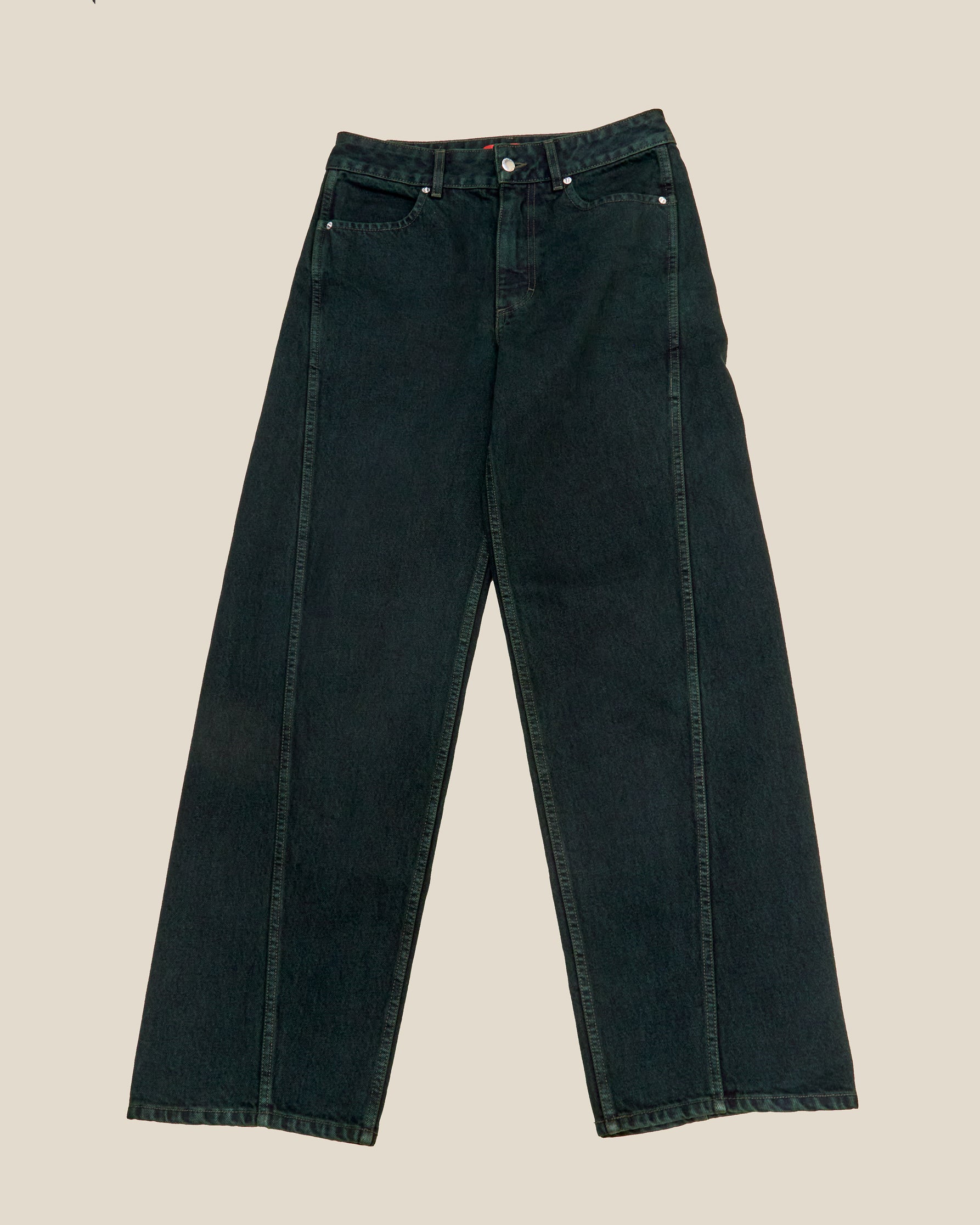 Mid-rise loose-fit jean in 14oz cotton denim, overdyed deep green and stone-washed. Features a bowed leg with twisted side seams, signature EL back pockets, and a 32" inseam for sizes 24–36.