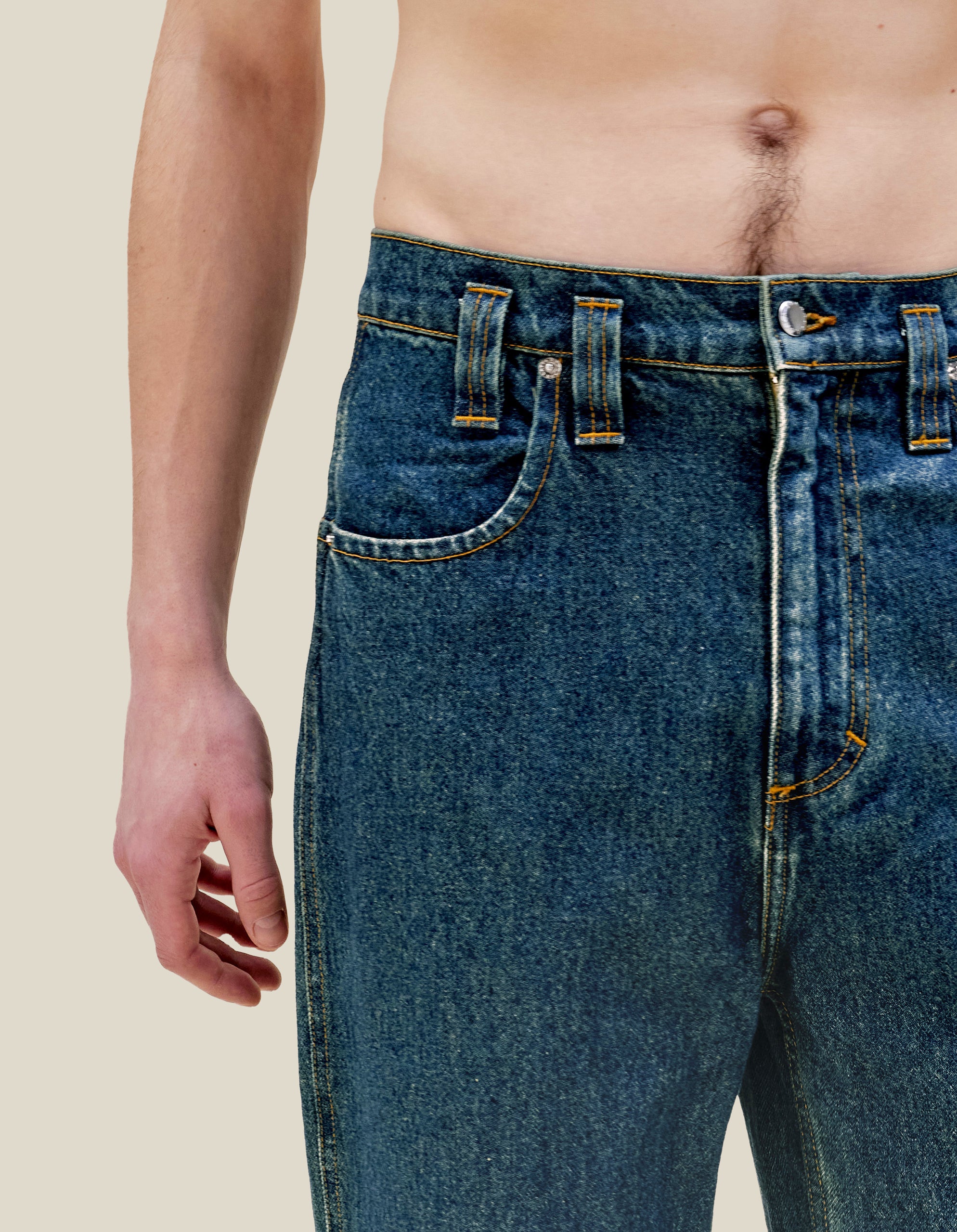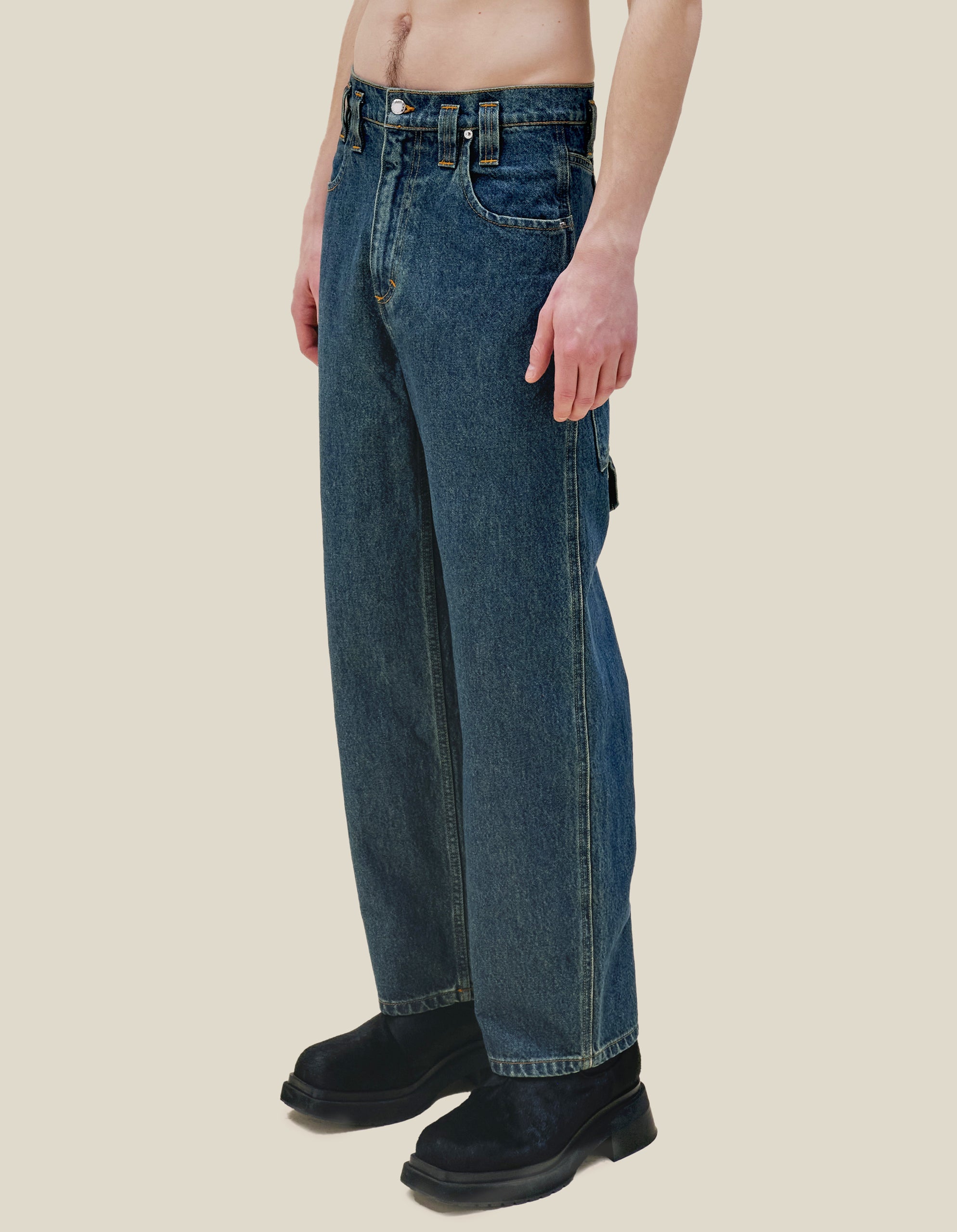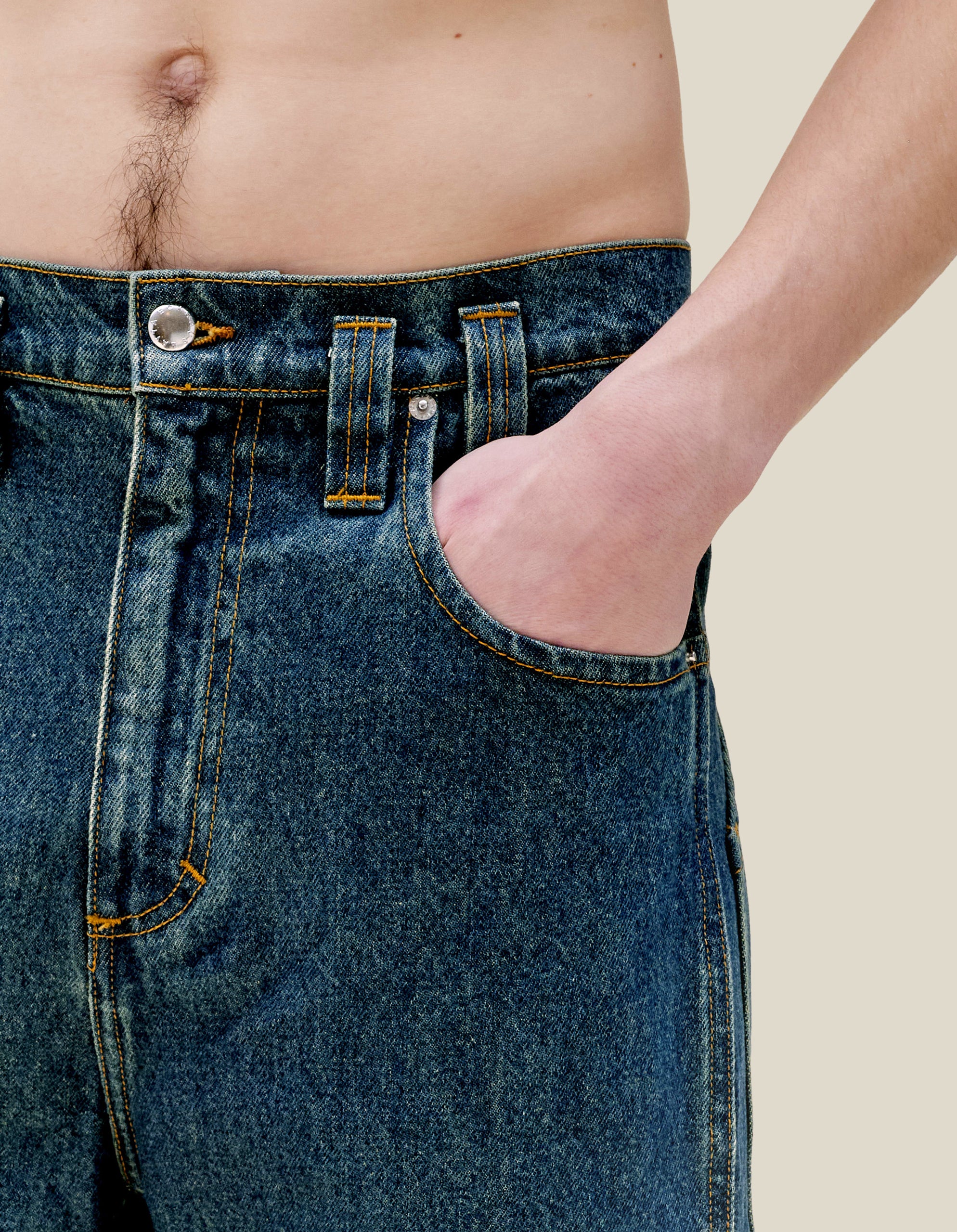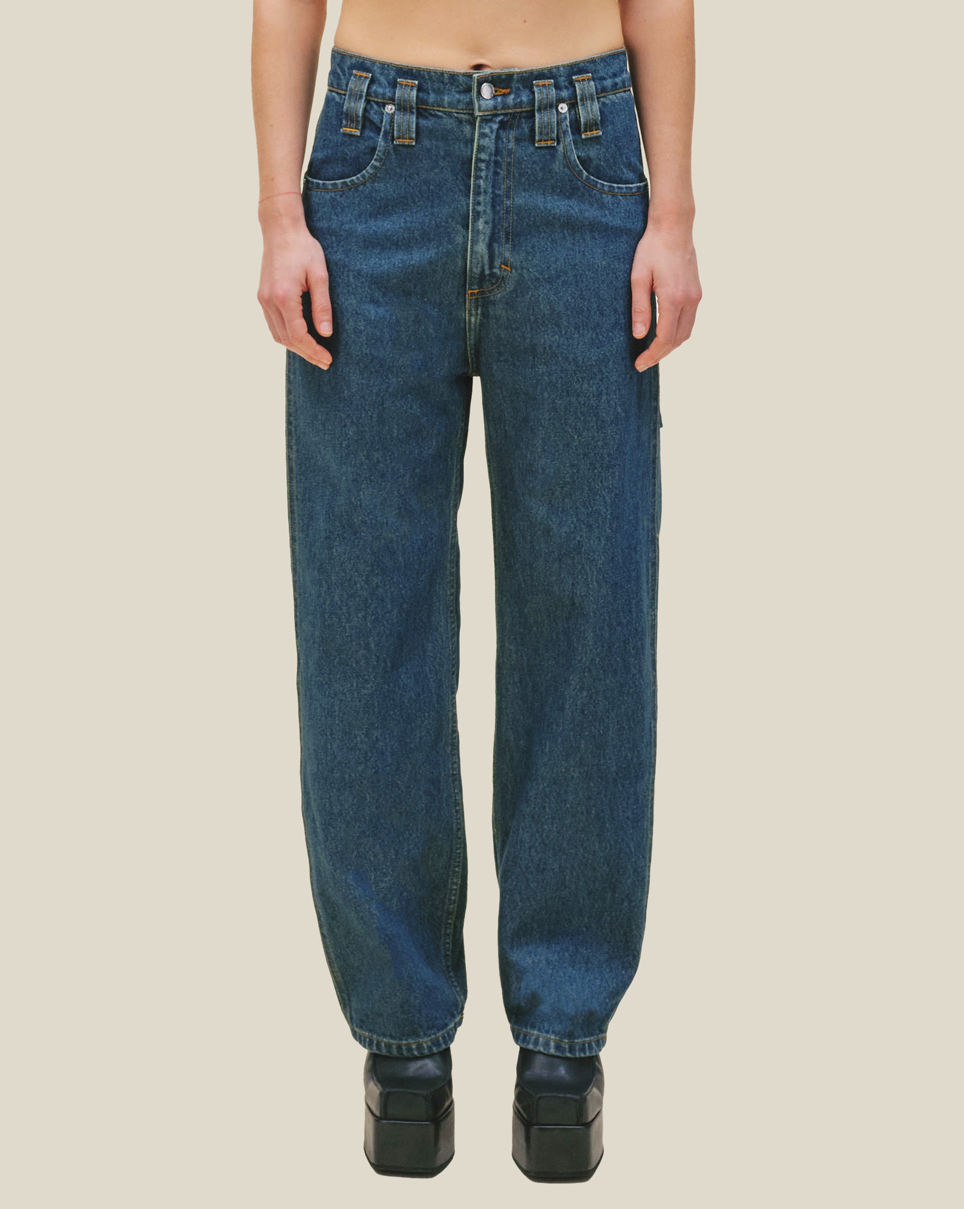 Our classic baggy jean is updated in our “New Blue” enzyme wash with over-dyed indigo. Includes signature back pockets and nickel hardware. The jeans are distinguished with our trademark back pockets that are exaggerated in scale with a carpenter's hammer loop on the back left pocket. They have a zip fly closure with a logo shank on the waistband and rivets on the front pockets in nickel hardware. Models wear sizes 27 and 30.