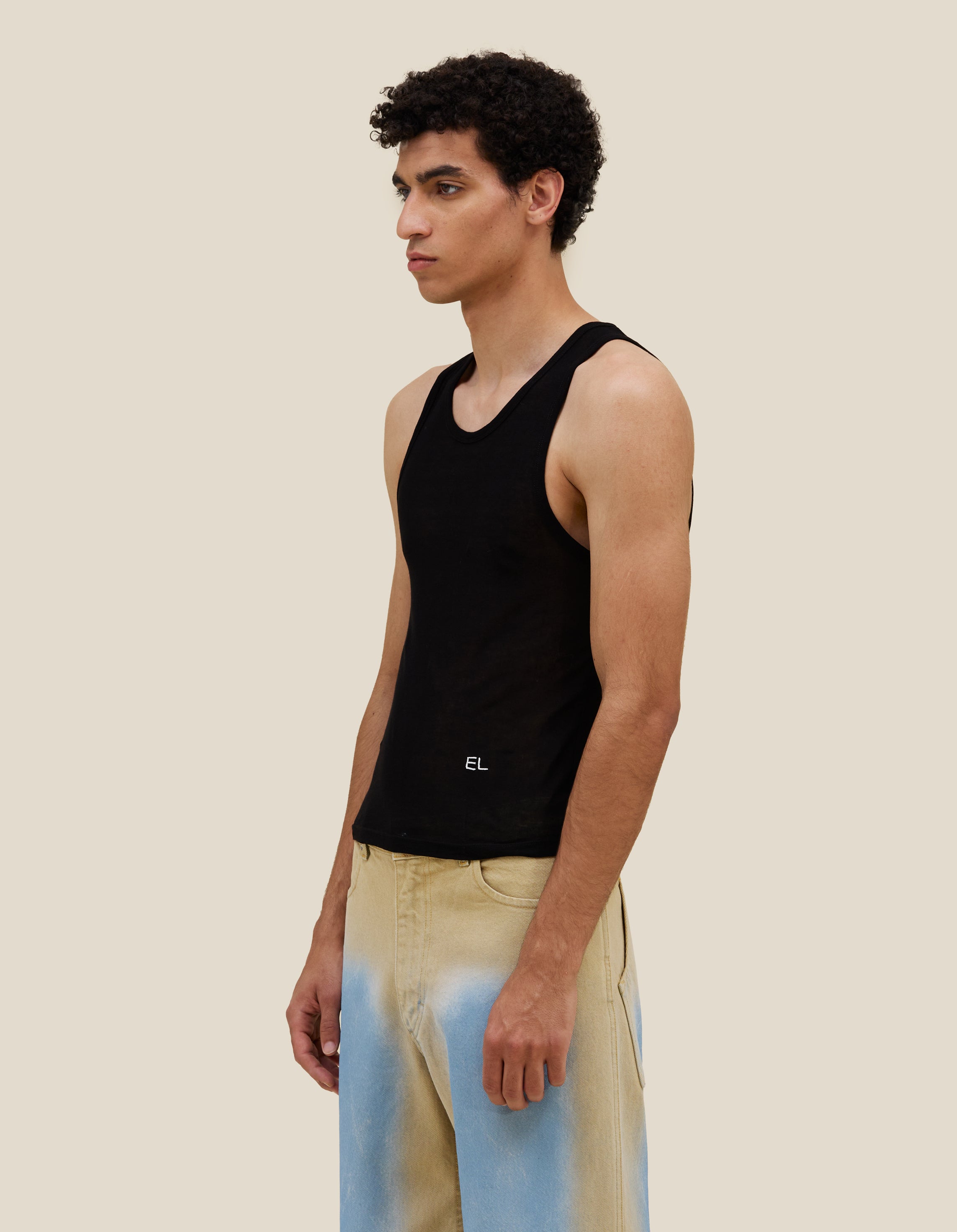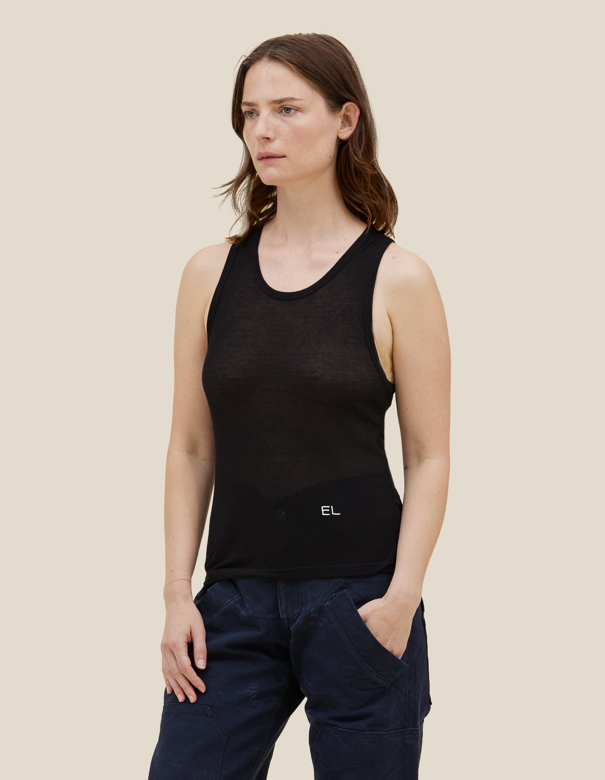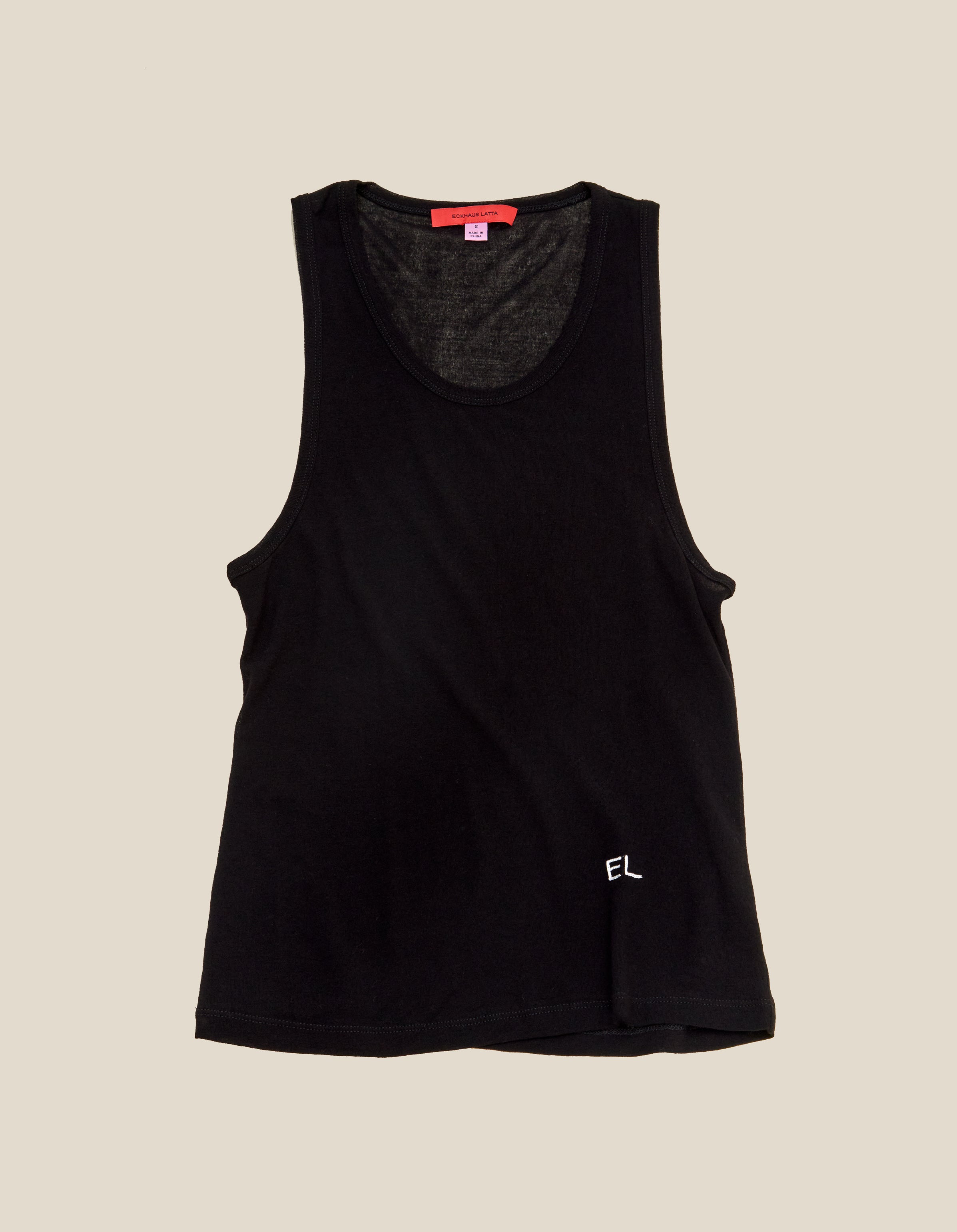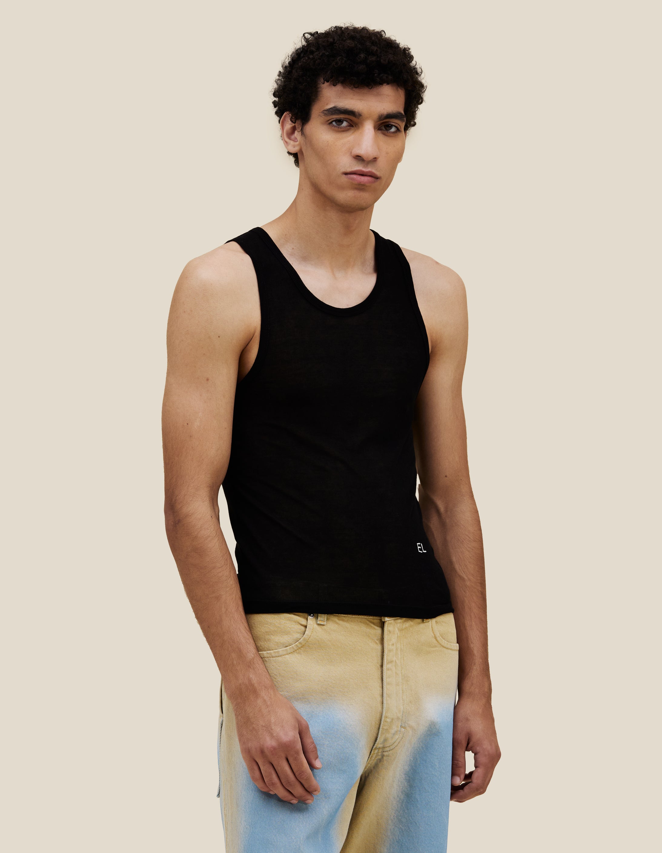 Slim-fitting tank in dry fine-gauge 1x1 cotton rib, featuring a red hand-embroidered "EL" logo on the left abdomen.