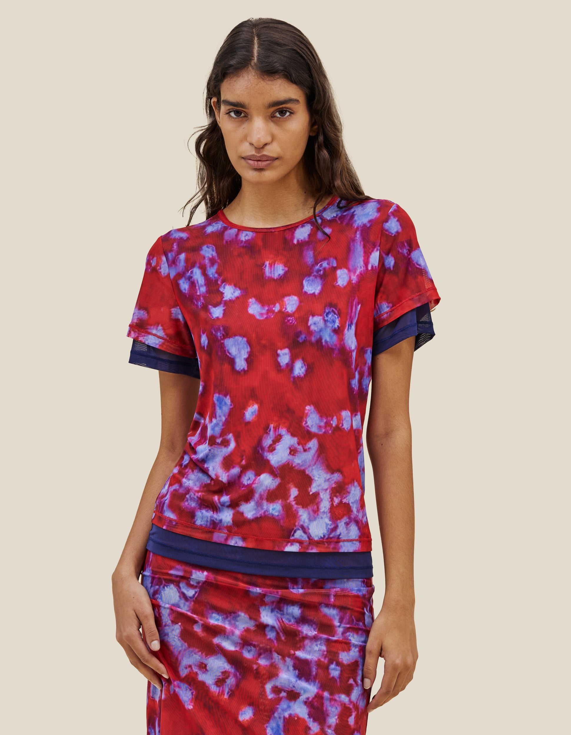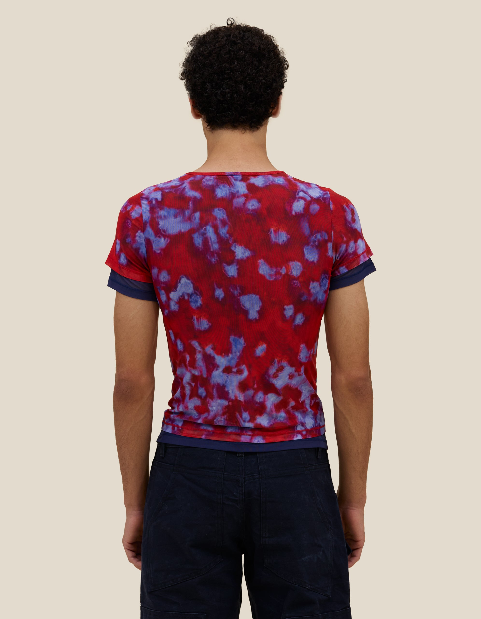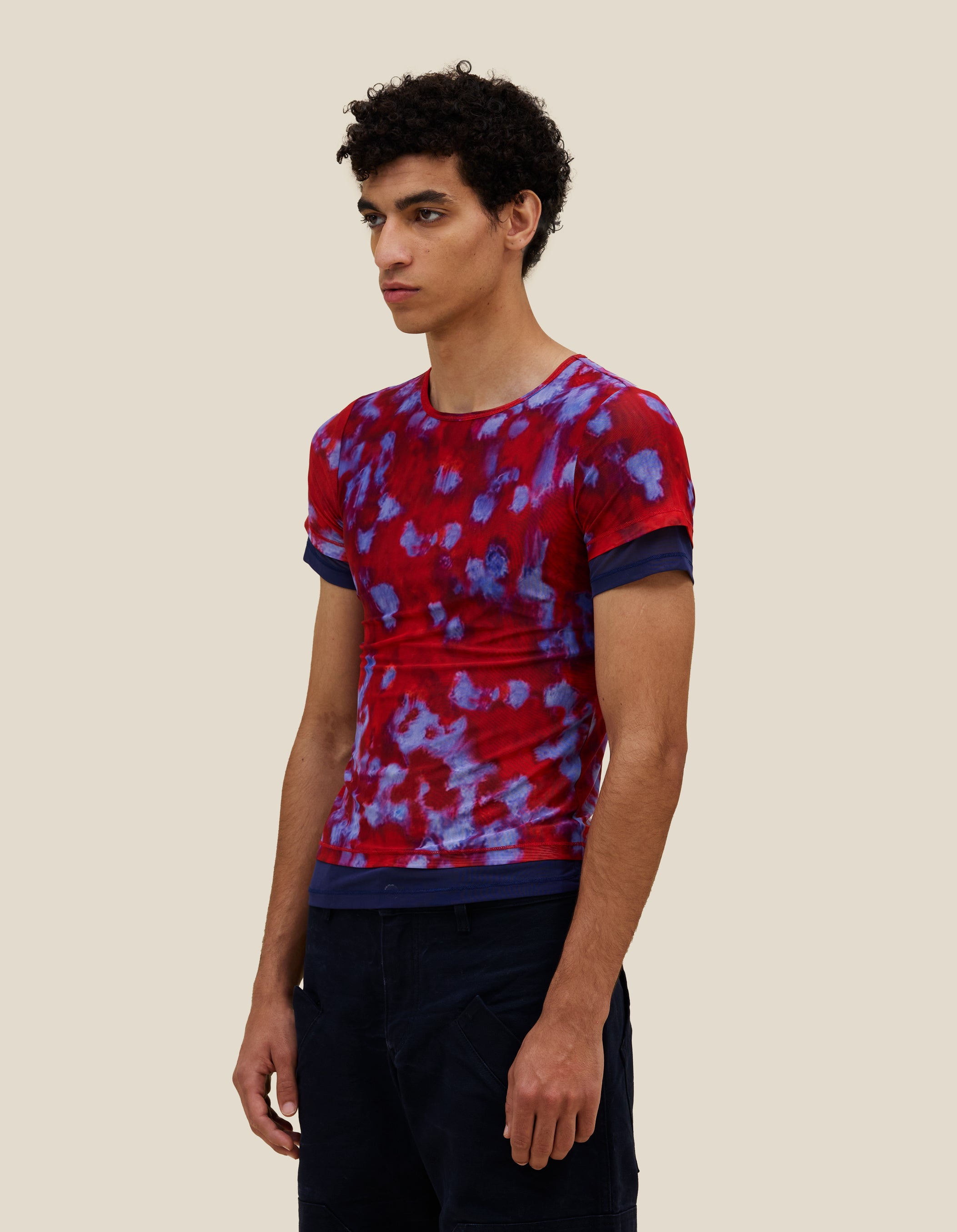 Unisex T-shirt in double-layer digitally printed micro mesh, featuring a distinct all-over print on the top layer and a bottom layer that peeks out from the hem.