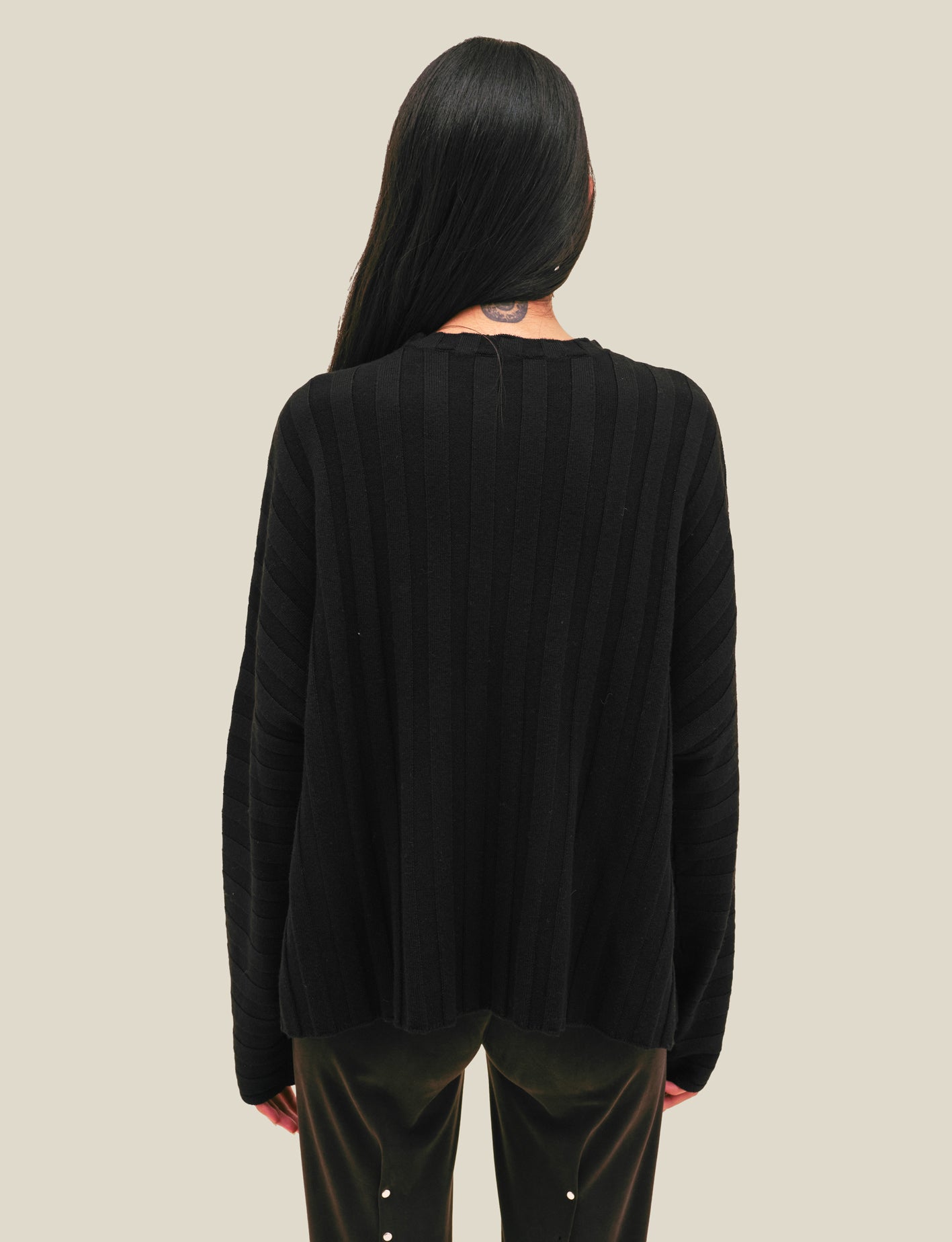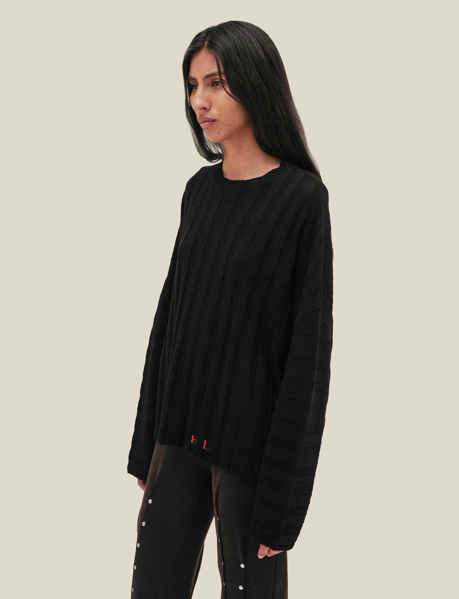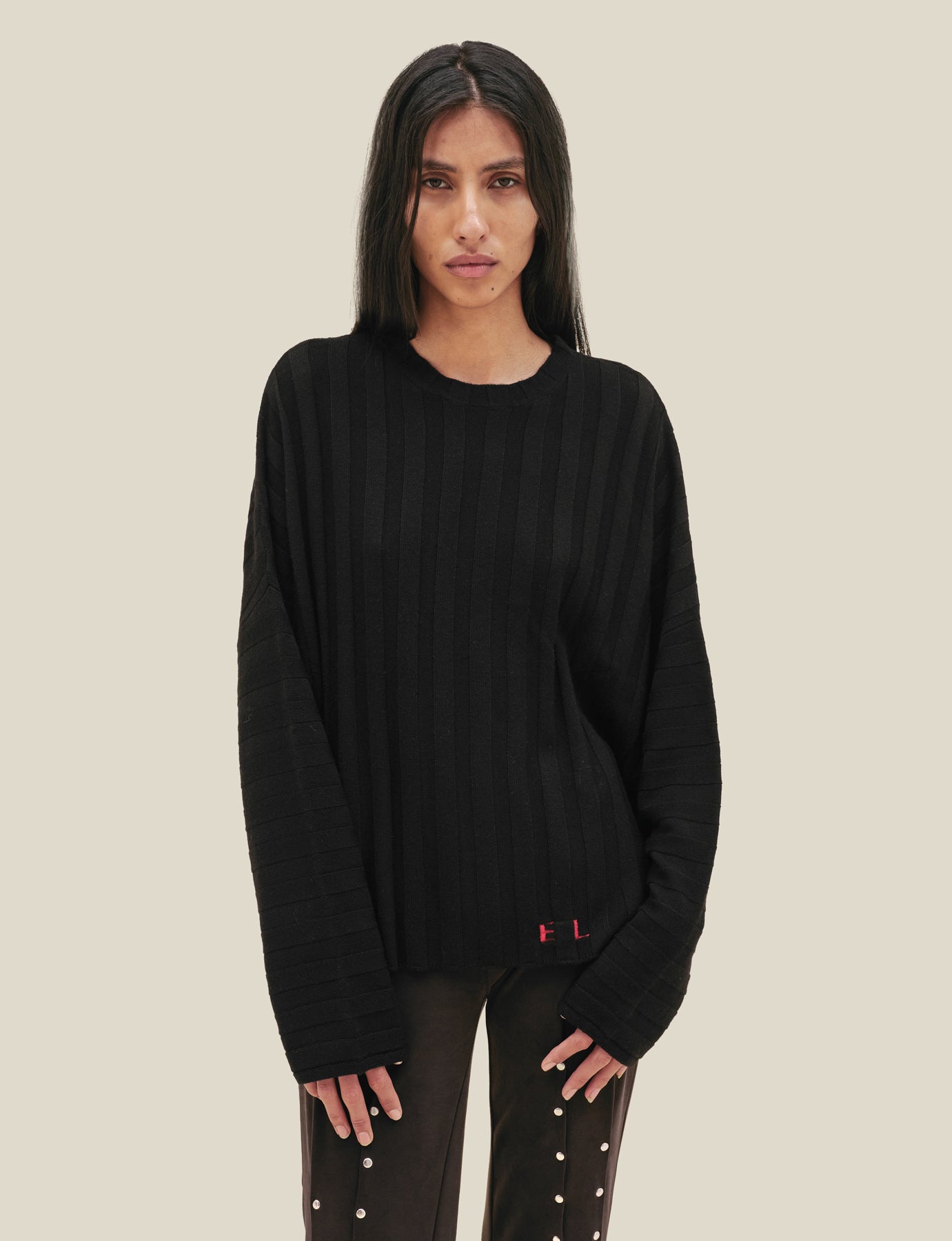 Boxy crewneck dolman shaped sweater in 100% merino wool with a black wide rib. Features our new intarsia knit EL logo. Colorway exclusive to Eckhaus Latta. Models wear size M.