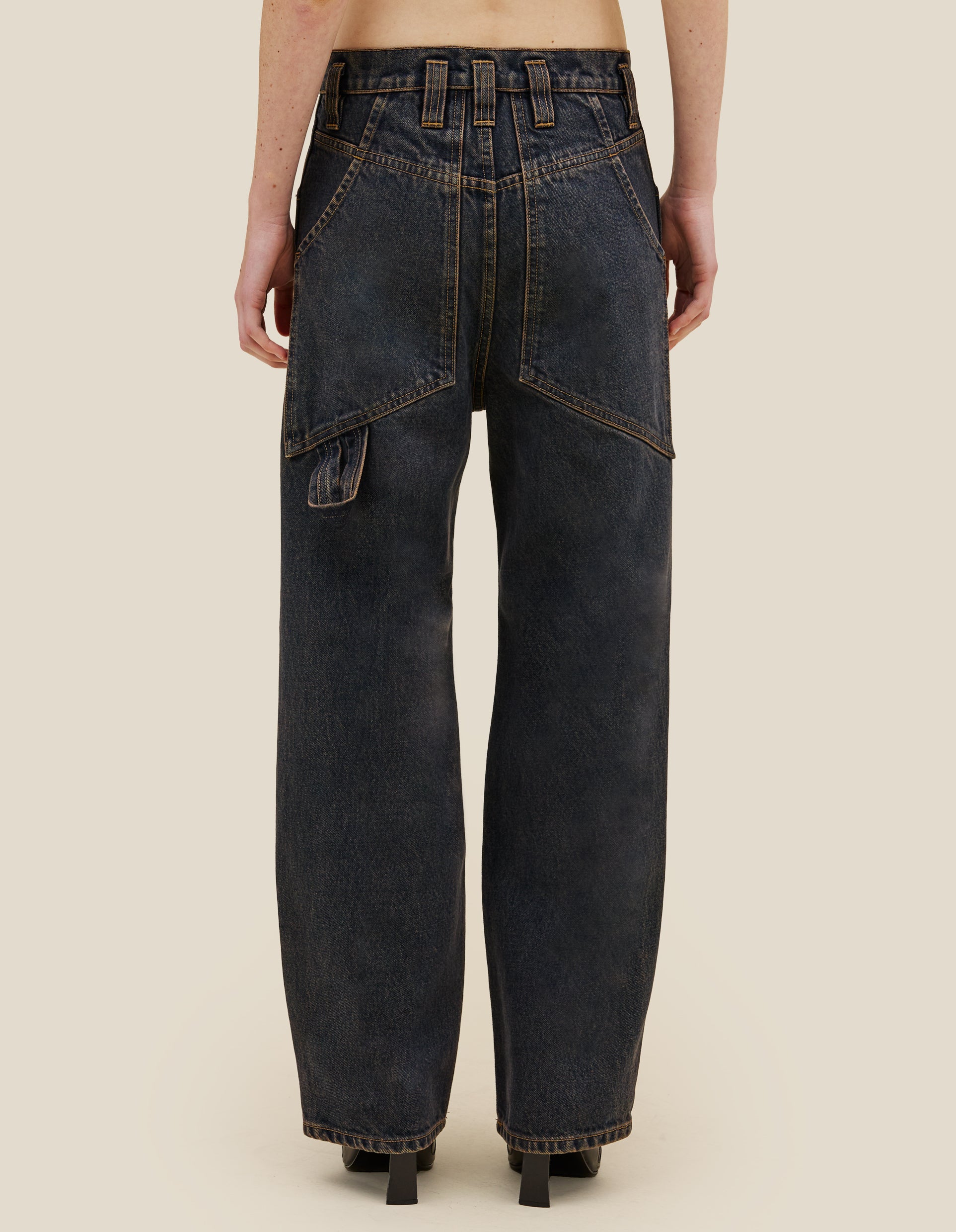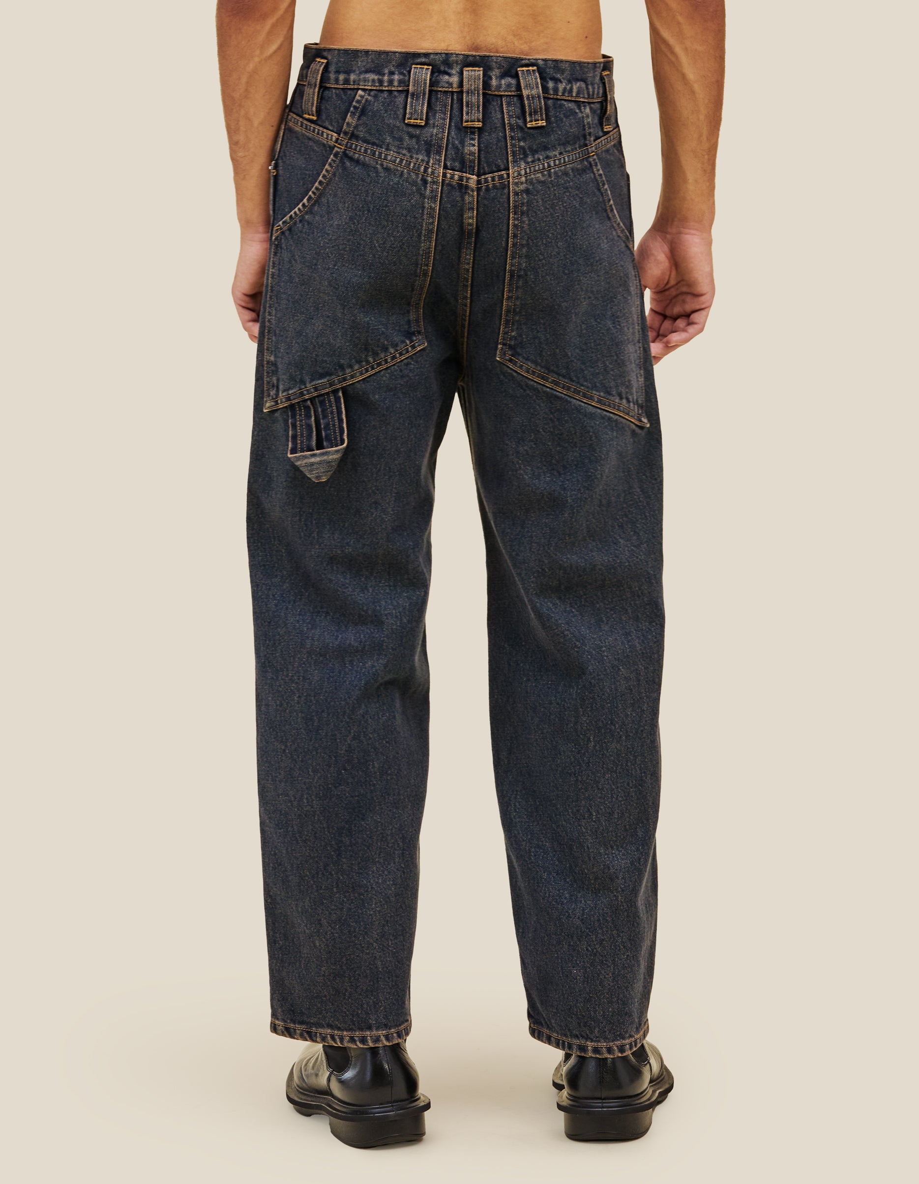 Relaxed-fit jean in 14oz cotton indigo denim, tinted light brown and stone-washed. Features signature oversized EL back pockets, double knee patch, hammer loop on the back left pocket, and a 28" inseam for sizes 24–36.